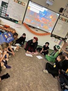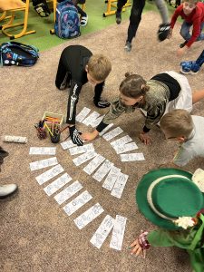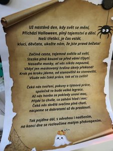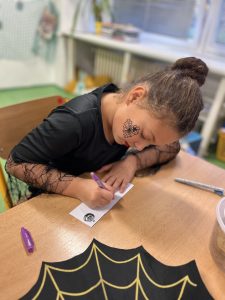 Nejdříve jsme se si povídali o rozdílech mezi Dušičkami a Halloweenem a četli si zajímavosti s touto tématikou. Poté následovaly akční hry: běhací aktivita s tajenkou a Halloweenská stezka v prostorách chodby.