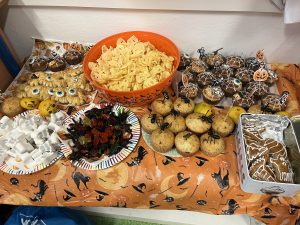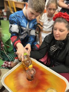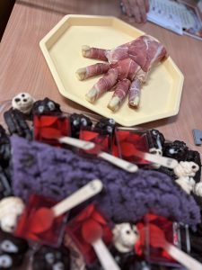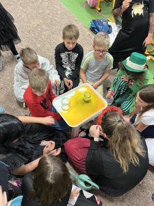 Nechyběla ani tvorba pokusů, roztančených fazolí, lektvarů a tvoření záložek. Společně jsme také strávili celou svačinu, kdy děti s rodiči přichystali originální, strašidelné a opravdu výborné pochutiny.  Nejatraktivnější aktivitou na závěr, kdy se děti opravdu soustředily a celou hru hltaly, byla úniková hra na tabletech. Na závěr si děti odnesly mini dušíky Otíky a porota ocenila ty nejoriginálnější kostýmy.