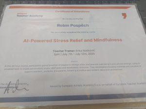Mobilita se uskutečnila v období od 7.7. do 12.7.2025 v chorvatském městě Split a měla název AI-Powered Stress Relief and Mindfulness. Zúčastnilo se jí celkem 13 učitelů ze škol různého stupně vzdělávání ze Španělska, Polska, Slovenska, Litvy, Maďarska, Rakouska a České republiky.