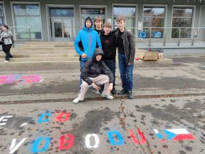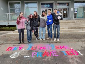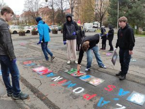 Na chodník před městským úřadem sprejovali nápisy, které měly odkazovat na revoluční dny. Třída 9.A sprejovala nápis: „Nezapomínáme, co nás stálo svobodu“ a 9.B připojila nápis: „Díky, že můžem…, právě teď!“