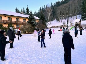 Odpoledne jsme odložili lyže a snowboardy a vrhli se na olympijské hry, tentokrát v netradičních disciplínách. Soutěžení plné smíchu a kreativity nás stmelilo a vytvořilo příjemnou atmosféru.
