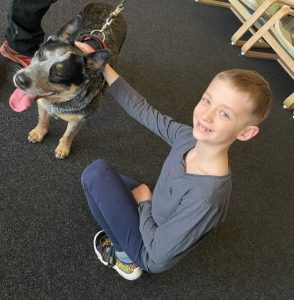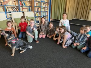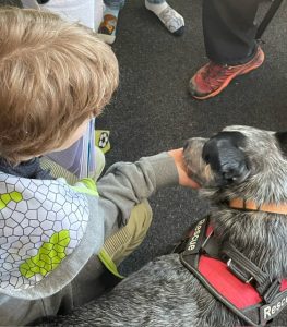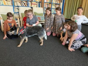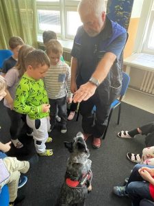 Naši žáci si mohli vyzkoušet, jaké to je spolupracovat se záchranářským psem, a měli možnost klást panu Kletenskému otázky.