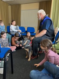 Ve čtvrtek 3. dubna 2025 navštívil naši školu pan Ladislav Kletenský z kynologického klubu Kopřivnice se svým psem Poly. Tato speciálně vycvičená fena se zaměřuje na vyhledávání osob v sutinách a předvedla nám, jak takový výcvik probíhá a jaké schopnosti musí záchranářský pes mít.