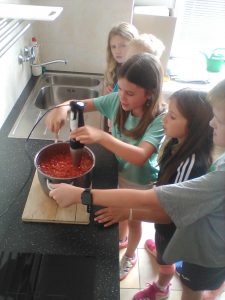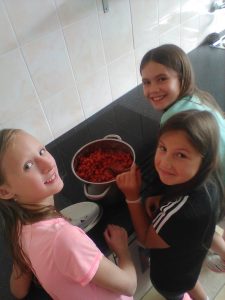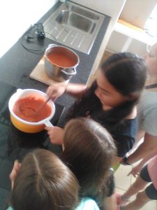 A hurá do kuchyňky, kde jsme šípky omyli, přidali hřebíček, krátce povařili. Teď už jen přidat cukr a propasírovat, ať se zbavíme slupek a semínek. Každý chce ochutnat a podává rychle svou skleničku.