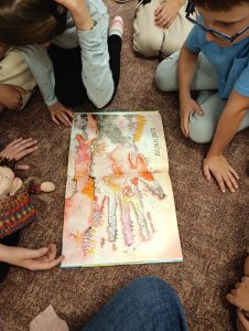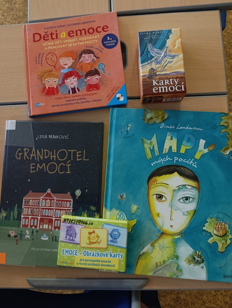 Nahlédli jsme také do knihy Mapy emocí, kde jsme podle ilustrací a barev hádali, jaké emoce znázorňují. To děti přivedlo k přemýšlení o příbězích v knize, které za emocemi stojí, i o jejich barevnosti a rozmanitosti.