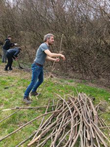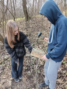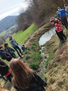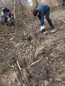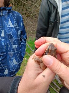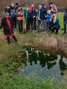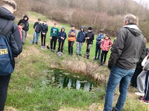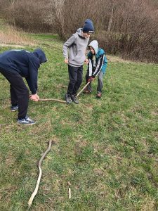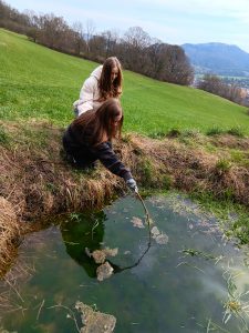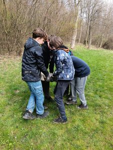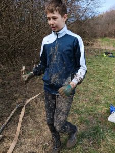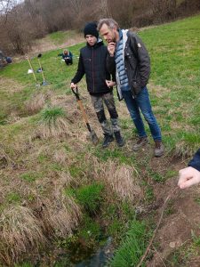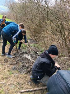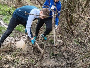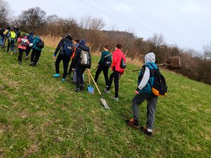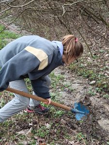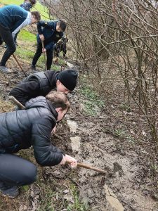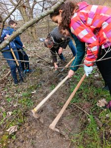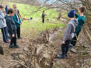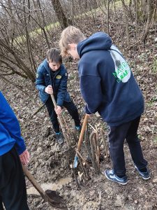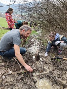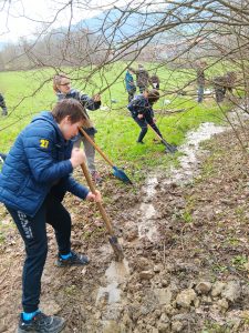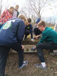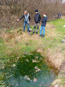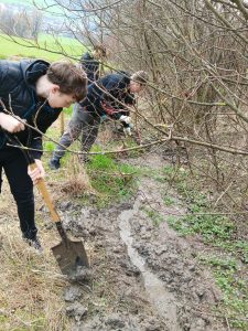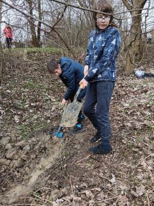 Druhý projektový den byl zaměřen na úpravu stávajících tůněk bohatých na místní biotop v blízkosti Čertova kamene a také vyčištění jejich okolí od odpadků. Mladí lidé tak vzali do rukou rýče a lopaty a vyrazili do terénu. Hned po zahájení prací je čekalo překvapení. “Našli jsme nový pramen vody,” zvolal první kopáč a ostatní se rychle přidali k práci na obnažování objeveného pramínku. Pak už děti nikdo nemohl zastavit od další práce. Čistili nový přítok tůněk od jílu a listí, dělali překážky v toku pramene větvemi a kameny, aby jej zmeandrovali, tvořili schody z cestičky vedoucí na Kamenárku s pomocí nalezených kusů dřeva a došlo i na přemisťování několik skokanů hnědých do bezpečí tůní.