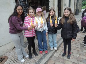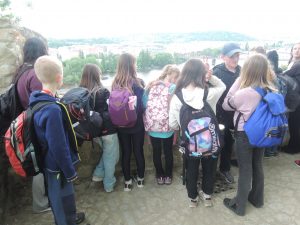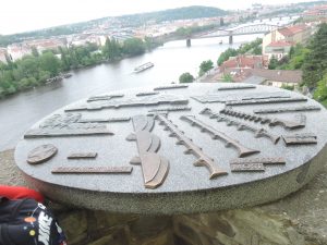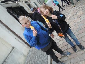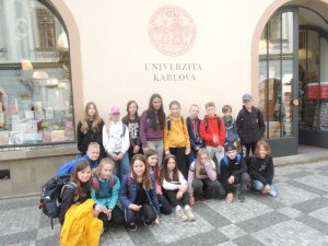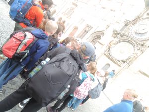 Odtud jsme se vydali po stopách Karla IV., u Prašné brány jsme navštívili ČNB, kde si děti potěžkaly v trezoru zlatou cihlu, mrkli jsme na základní kámen Karlovy univerzity, a pak se přes Staroměstské náměstí dostali k Orloji, který zrovna odbíjel 12 hodinu. Nakonec jsme došli až ke Karlovu mostu, kde naše procházka končila.